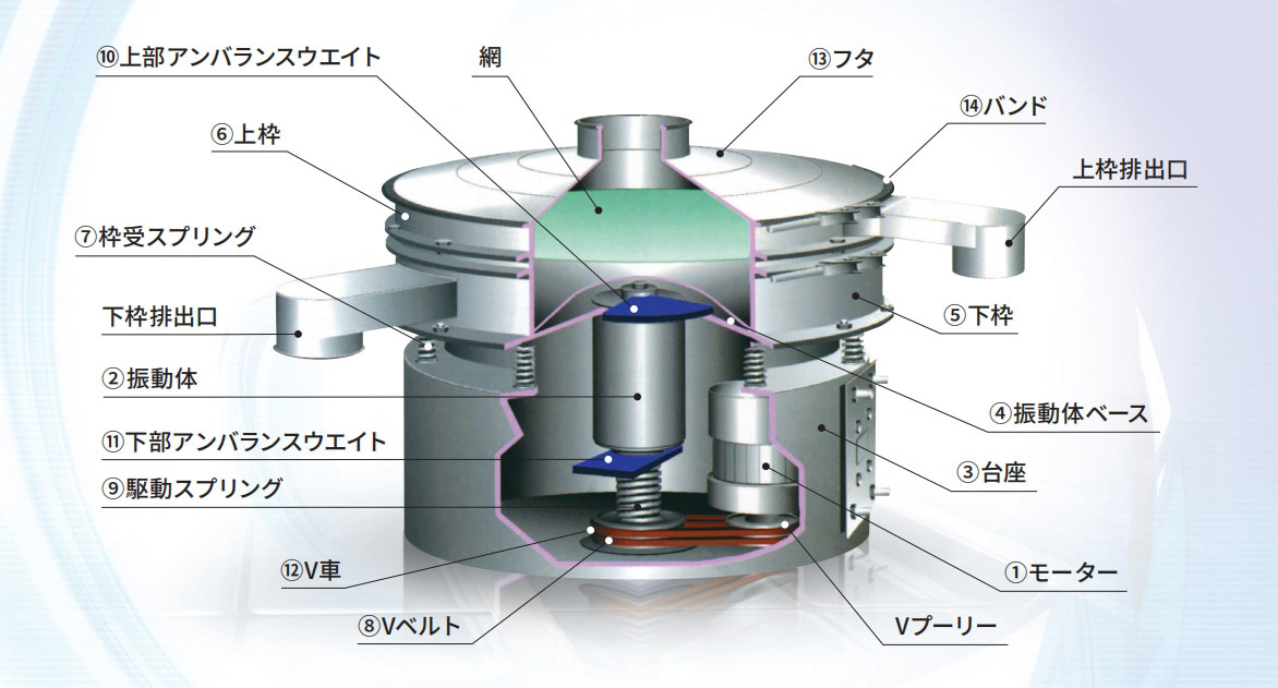振動(dòng)體は一般的な円型振動(dòng)ふるい機(jī)とは異なり、汎用モ一タ一を使用し.簡(jiǎn)単な軸継手と堅(jiān)牢な振動(dòng)発生機(jī)構(gòu)を駆使して、円型ふるい機(jī)の特長(zhǎng)である三次元運(yùn)動(dòng)(水平、垂直、傾斜)を効率的に発生させることに成功した、従來(lái)にない畫(huà)期的な構(gòu)造です。