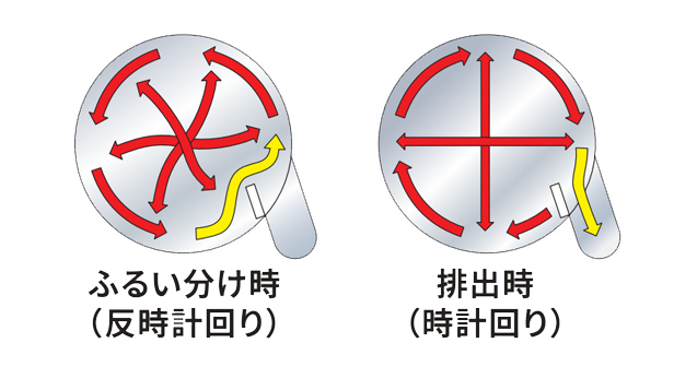 リバース機(jī)能では、ふるい分け時(shí)(反時(shí)計(jì)回り)と排出時(shí)(時(shí)計(jì)回り)とで原料の流れを逆転させ、その繰返し運(yùn)転を行うことによって、最も効率的に95%以上の完璧に近いふるい分け・排出を可能にしました。