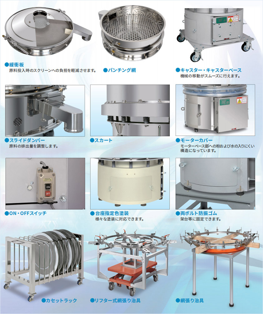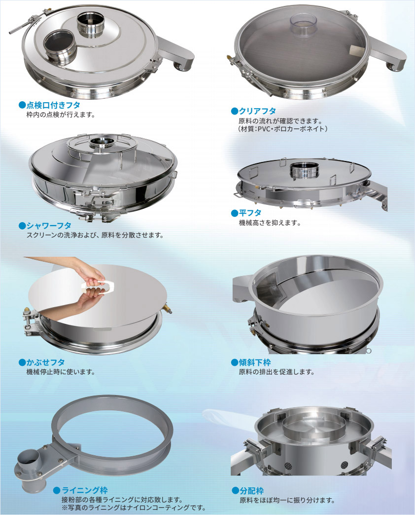 KOWAでは振動(dòng)ふるい機(jī)のベース製品に対応可能な各種オプション品をご用意。作業(yè)條件や使用環(huán)境に合わせて、必要な用途のオプション品をお選ひいただくことで、より便利·快適に作業(yè)効率を向上させることができます。