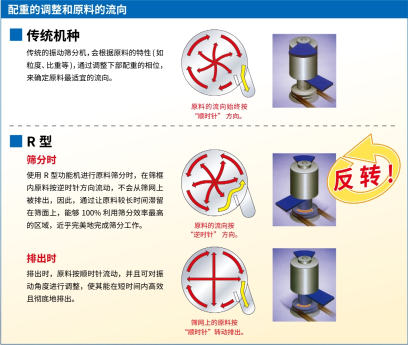 而在反轉(zhuǎn)功能機(jī)中,能夠在篩分和排出這兩個(gè)階段使原料的流動(dòng)方向逆轉(zhuǎn)。