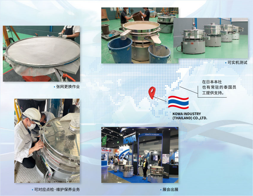 公司位于泰國(guó)曼谷郊外,從開展泰國(guó)國(guó)內(nèi)的保養(yǎng)維護(hù)業(yè)務(wù)起步,作為亞洲地區(qū)的銷售據(jù)點(diǎn)于 2016 年 3 月設(shè)立。自 2020年起,我們開始在泰國(guó)進(jìn)行篩分機(jī)的組裝業(yè)務(wù),著力打造讓海外客戶也能安心使用產(chǎn)品的環(huán)境。今后,我們也將在海外實(shí)現(xiàn) “與日本本土一致的優(yōu)質(zhì)服務(wù)” 為目標(biāo)繼續(xù)努力。