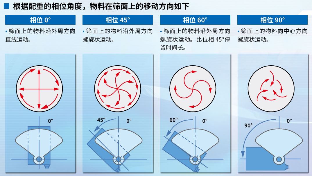 振動(dòng)篩分機(jī)基本上是以篩面為中心進(jìn)行振動(dòng)的設(shè)備,其振動(dòng)是由安裝在振動(dòng)體兩端軸上的配重塊產(chǎn)生的。上部配重的旋轉(zhuǎn)會(huì)使篩面產(chǎn)生水平振動(dòng),起到將輸送至篩面中心的物料向旋轉(zhuǎn)方向移動(dòng)的作用。下部配重的旋轉(zhuǎn)則會(huì)使篩面產(chǎn)生垂直振動(dòng),起到將物料向外周方向移動(dòng)的作用。這些振動(dòng)結(jié)合在一起,從而使篩面產(chǎn)生三維運(yùn)動(dòng)。通過改變下部配重相對(duì)于上部配重的相位,振動(dòng)的性質(zhì)會(huì)發(fā)生變化,能夠獲得適合待處理物料特性的運(yùn)動(dòng)。