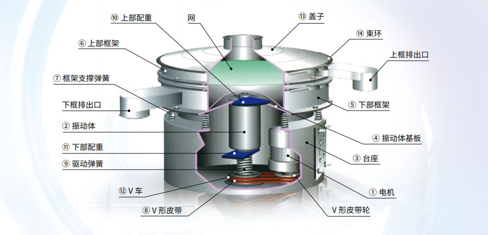 通過在振動(dòng)體上設(shè)置上下配重,可實(shí)現(xiàn)水平、垂直、傾斜的三維運(yùn)動(dòng),能夠根據(jù)原料特性進(jìn)行篩分處理。