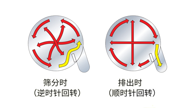 反轉(zhuǎn)功能,可使篩分階段(逆時(shí)針回轉(zhuǎn))與排出階段(順時(shí)針回轉(zhuǎn))的原料流向逆轉(zhuǎn),通過反復(fù)運(yùn)行,可實(shí)現(xiàn)最高效、接近 95% 以上的完美篩分與排出。